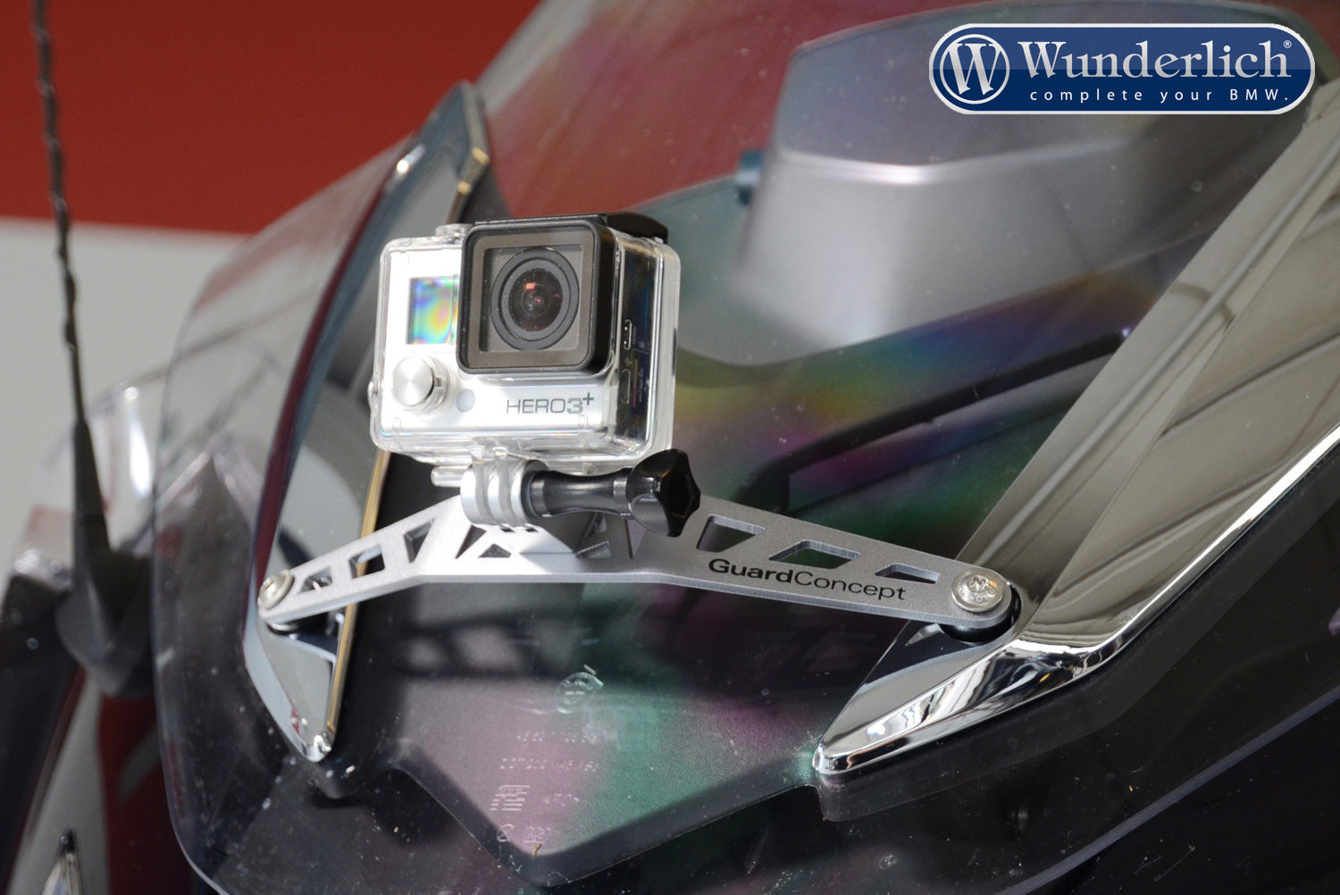 The CamRack is a bracket that positions the camera in front of the windshield, keeping the camera free of vibrations and providing unshakeable hold and which sits as close to the center of gravity of the 'rider machine' grounding system - only by doing so can the fluctuations along the vehicle's transverse axis ('pitching' motions) be kept in check while riding.The CamRack meets these requirements perfectly. It attaches to the solid attachment points on the windshield, i.e. a sturdy pipe structure, that has been designed by BMW for absorbing the highest wind pressure forces. This means that the CamRack sits here free of vibrations with a firm hold. The CamRack is attached using the screws and plastic washers supplied in the set, thus avoiding any damage to the windshield.Function
