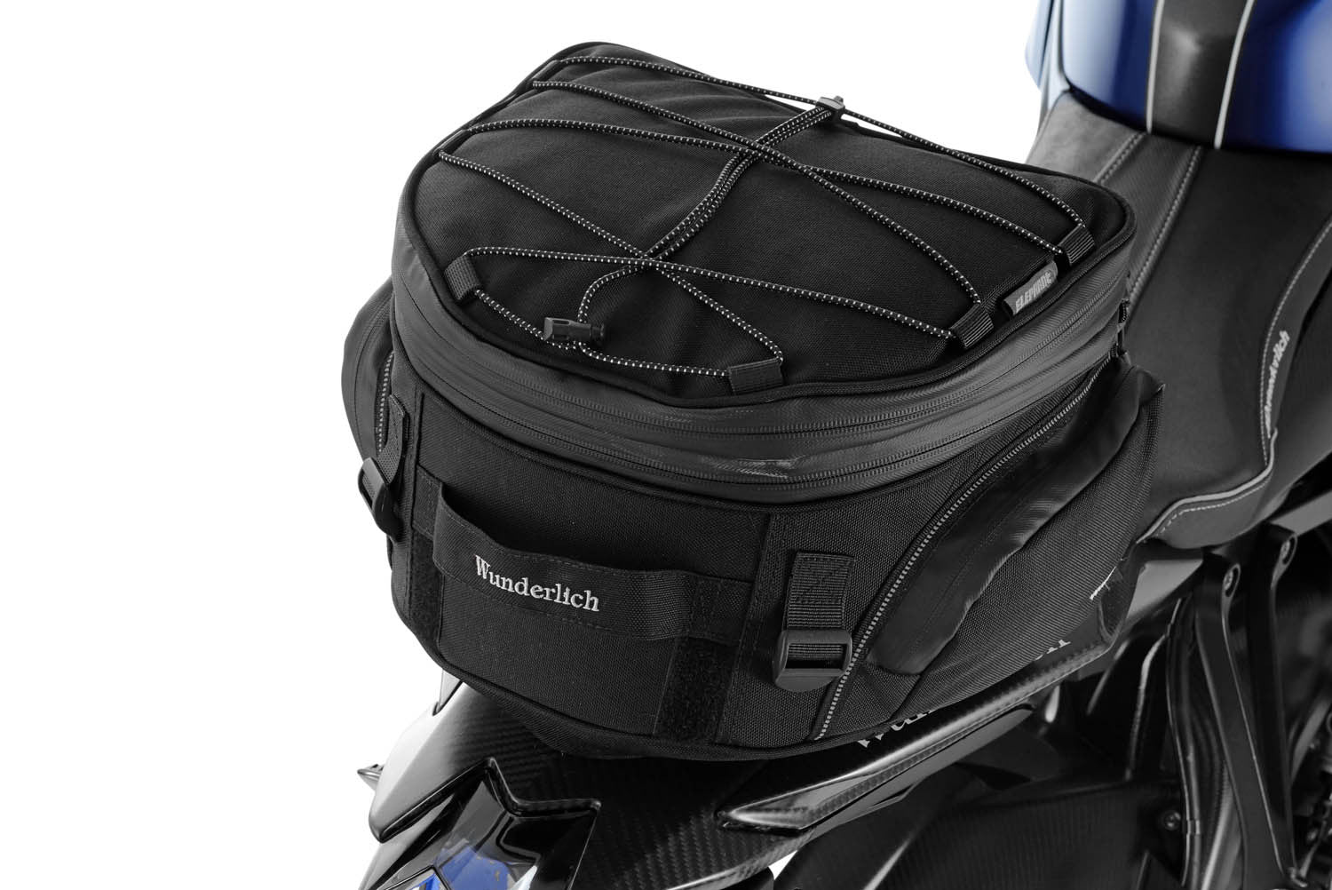 Can be attached to the passenger seat or to the lugga ge rack. Expandable up to a 20 liter maximum capacity. Expands and compacts with perimeter zipper. Innovative quick attachment. Crossed shock cords on top for quickly securing gloves, hat, etc. Reinforced walls that maintain the bags' shape and protects the fabric. Blue interior lining adds an additional water barrier and makes it easier to find small items. Ergonomic zipper pulls. Waterproof, Teflon-coated CORDURA weave material. Strong, abrasion and fade resistant. Ergonomic carrying handle. Lightweight. Made in Germany & Europe.