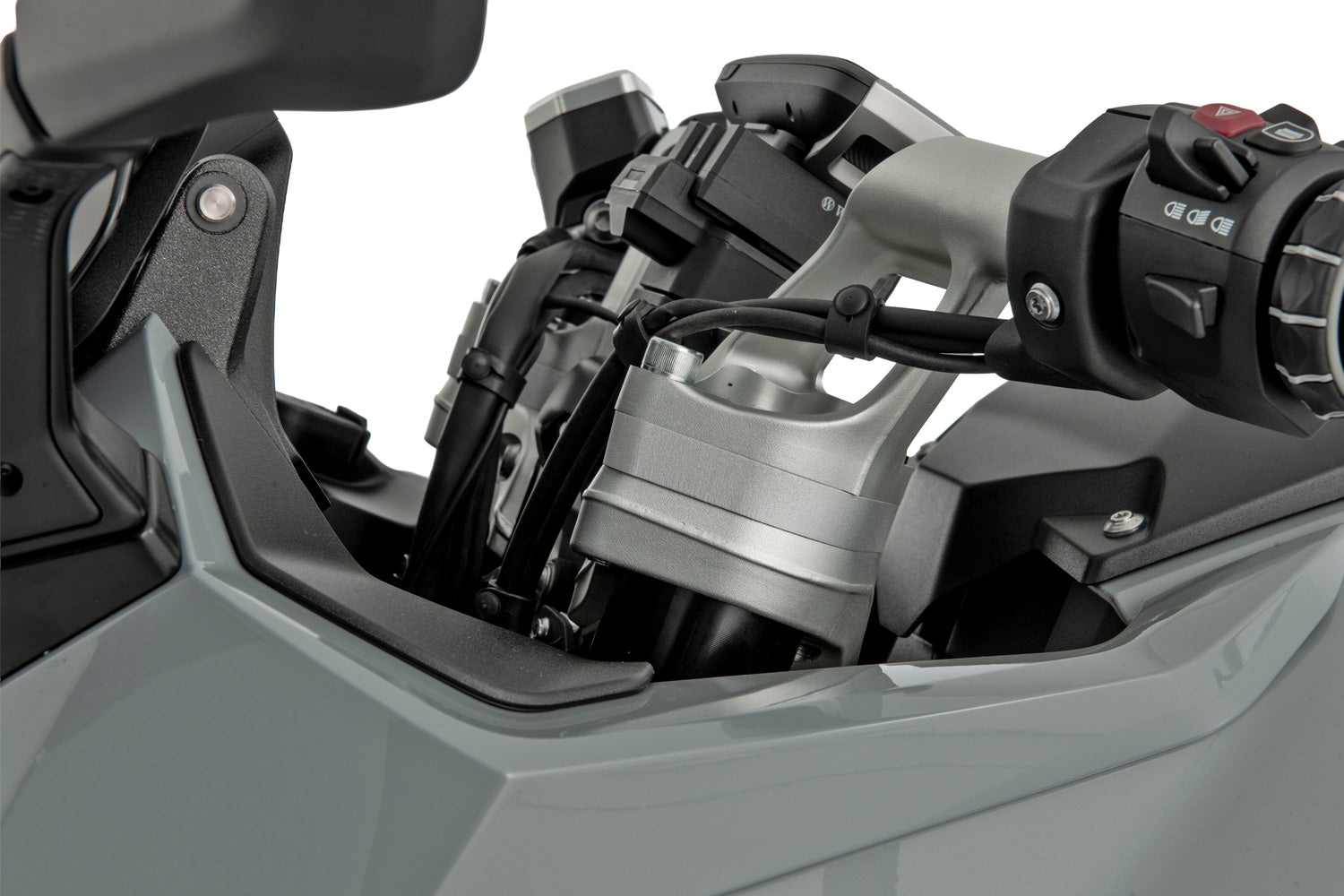 The handlebar riser specially developed by our engineers raises the clip-on handlebars by 15 millimetres. The height is optimally tuned for sporty use. The ergonomic effects are significant, as they relax the entire back muscles and arms while relieving the spine, pelvis and coccyx. This significantly improves comfort and noticeably reduces fatigue on long journeys. Overall, the handlebar riser supports a sporty, relaxed and intuitive riding style that contributes to greater active riding safety, as well as better visibility of traffic thanks to the more upright seating position.