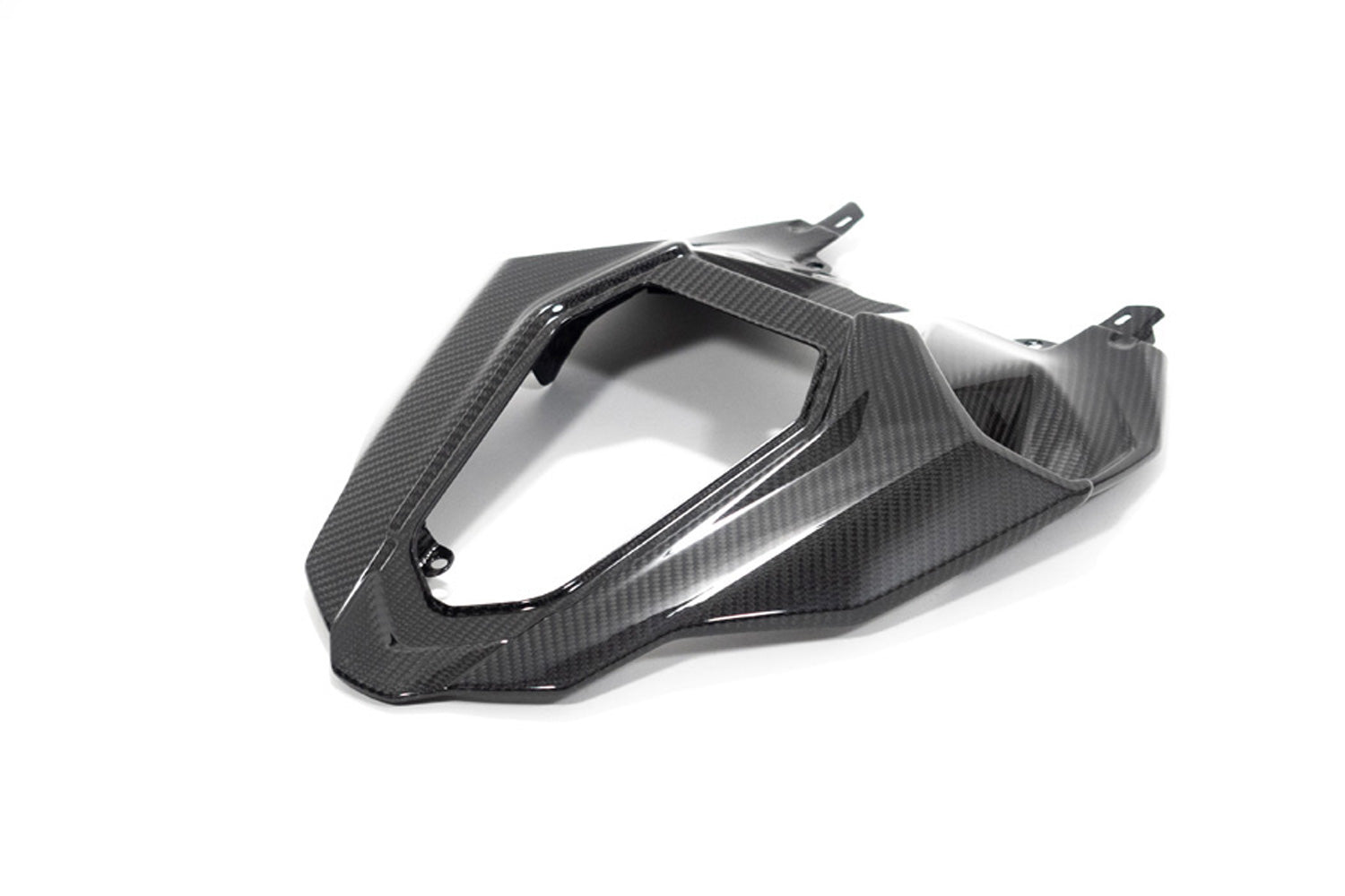 This space age material unfolds its full potential with up to 70% weight decrease compared to the standard part and its weight-specific stiffness. Form follows function here and integrates optimally into the design of the motorcycle. The contours of the machine are incorporated as well as the material and surface texture of neighbouring series components. This carbon component underscores the high-tech claim of your BMW with the unique appeal of real carbon.
