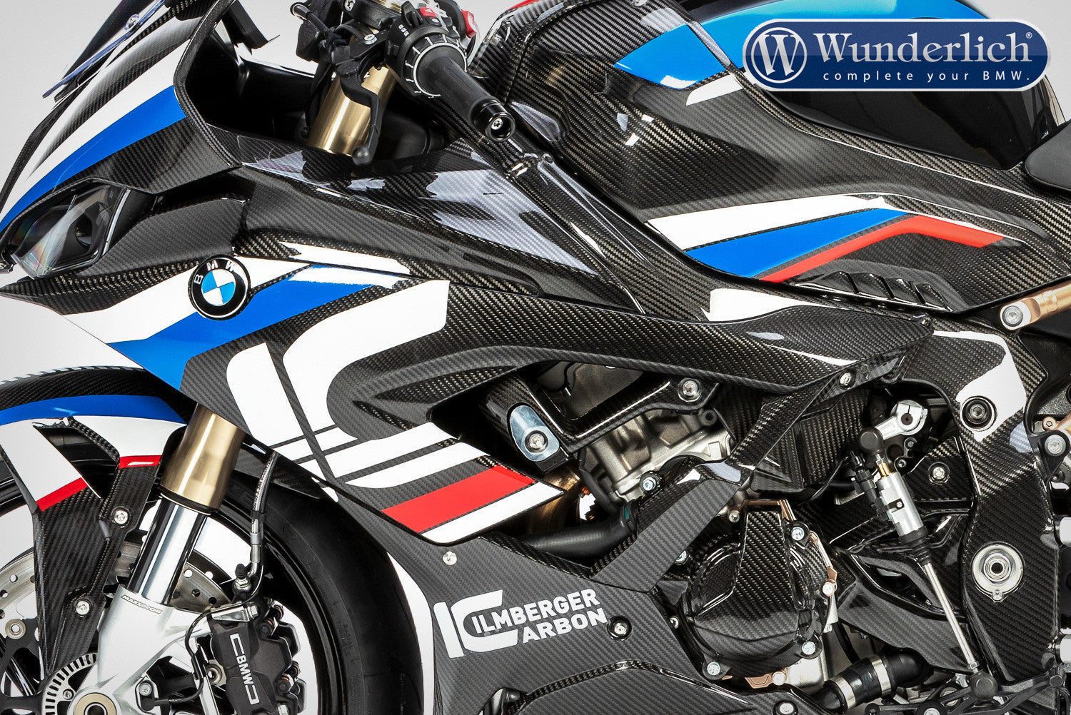 This space age material unfolds its full potential with up to 70% weight decrease compared to the standard part and its weight-specific stiffness. Form follows function here and integrates optimally into the design of the motorcycle. The contours of the machine are incorporated as well as the material and surface texture of neighbouring series components. This carbon component underscores the high-tech claim of your BMW with the unique appeal of real carbon.