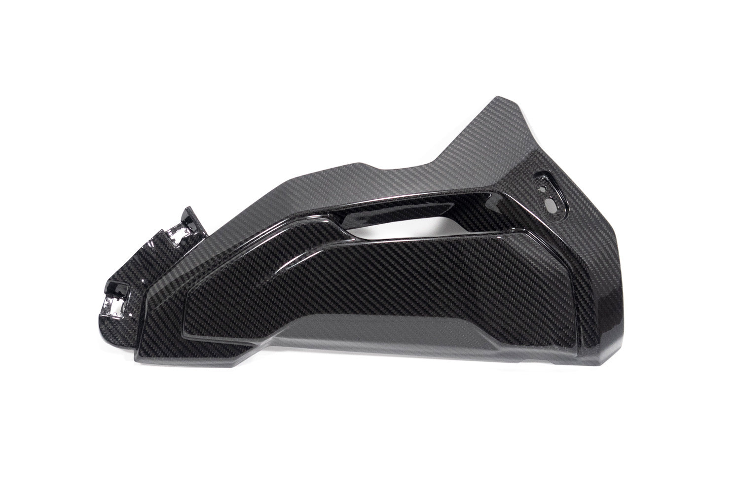 This space age material unfolds its full potential with up to 70% weight decrease compared to the standard part and its weight-specific stiffness. Form follows function here and integrates optimally into the design of the motorcycle. The contours of the machine are incorporated as well as the material and surface texture of neighbouring series components. This carbon component underscores the high-tech claim of your BMW with the unique appeal of real carbon.