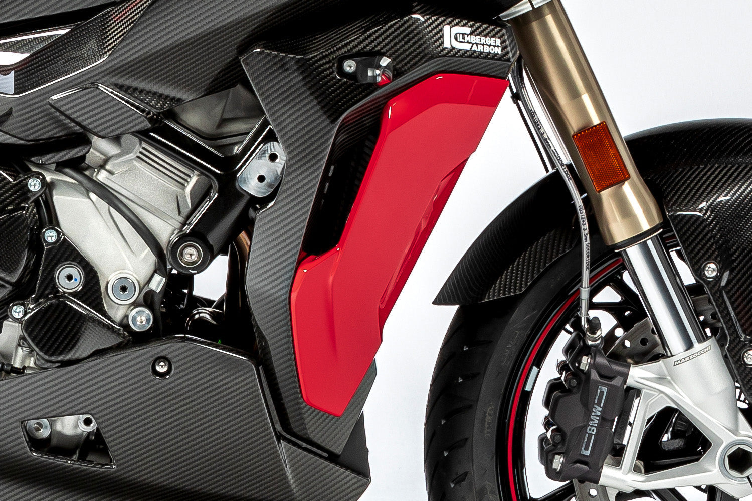This space age material unfolds its full potential with up to 70% weight decrease compared to the standard part and its weight-specific stiffness. Form follows function here and integrates optimally into the design of the motorcycle. The contours of the machine are incorporated as well as the material and surface texture of neighbouring series components. This carbon component underscores the high-tech claim of your BMW with the unique appeal of real carbon.