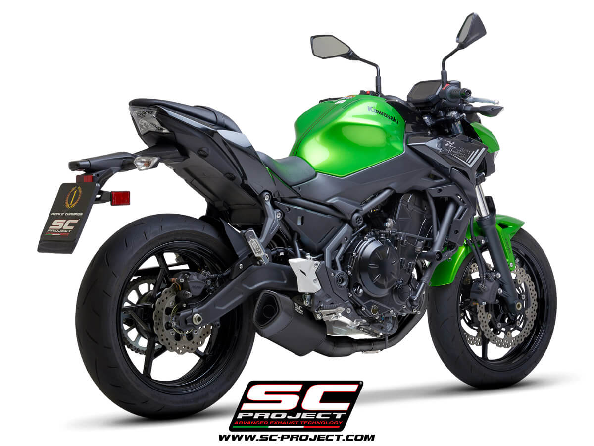 The SC-Project full system exhaust is the direct result of the research, development and design work carried out by the R&D department together with the major MotoGP and SBK World Championship Teams. SC-Project, with the aim of improving performance and aesthetics of the Your Kawasaki Ninja 650 has created a complete unit designed to house the original lambda probe, showcases first-class technical solutions: the use of CNC machined bushings turned from solid allow the exhaust system impeccable coupling that make fitting easier and improve system performance; the implementation of a lighter system ensures better bike rideability. The production of pipes of variable dimensions guarantees a marked increase in performance both in terms of torque and maximum power through the entire bend.
