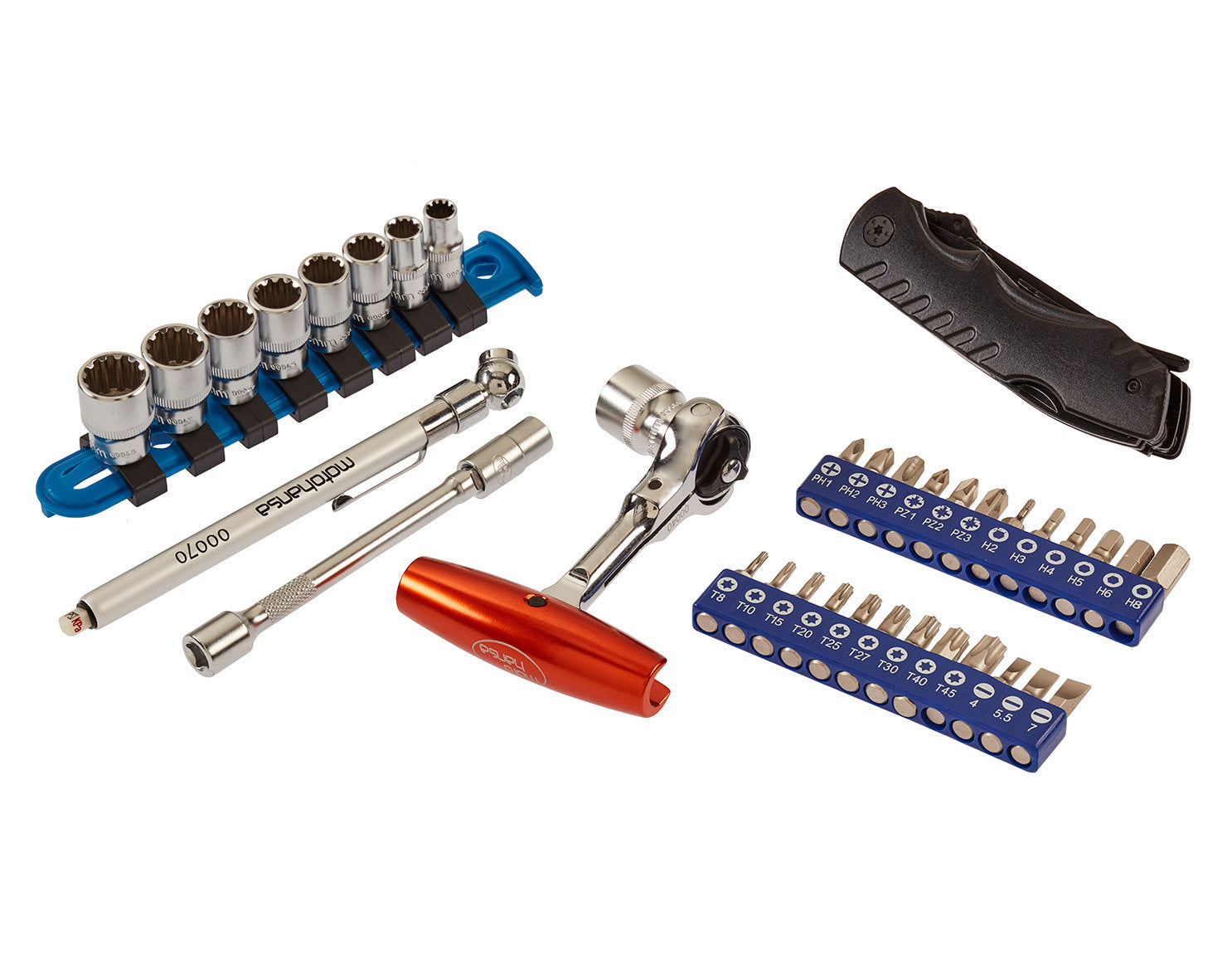 The Pro Compact motorcycle tool kit has been designed by Simon Pavey (10 x times Paris Dakar rider) and is used exclusively at Simon’s Off Road Skills motorcycle courses in Wales and Portugal. It has been designed for the rider looking for a more compact, lightweight kit. The tool kit stores easily on your bike, taking up minimal space yet still containing all the tools required to tighten loose items and undertake emergency repairs when off-road.