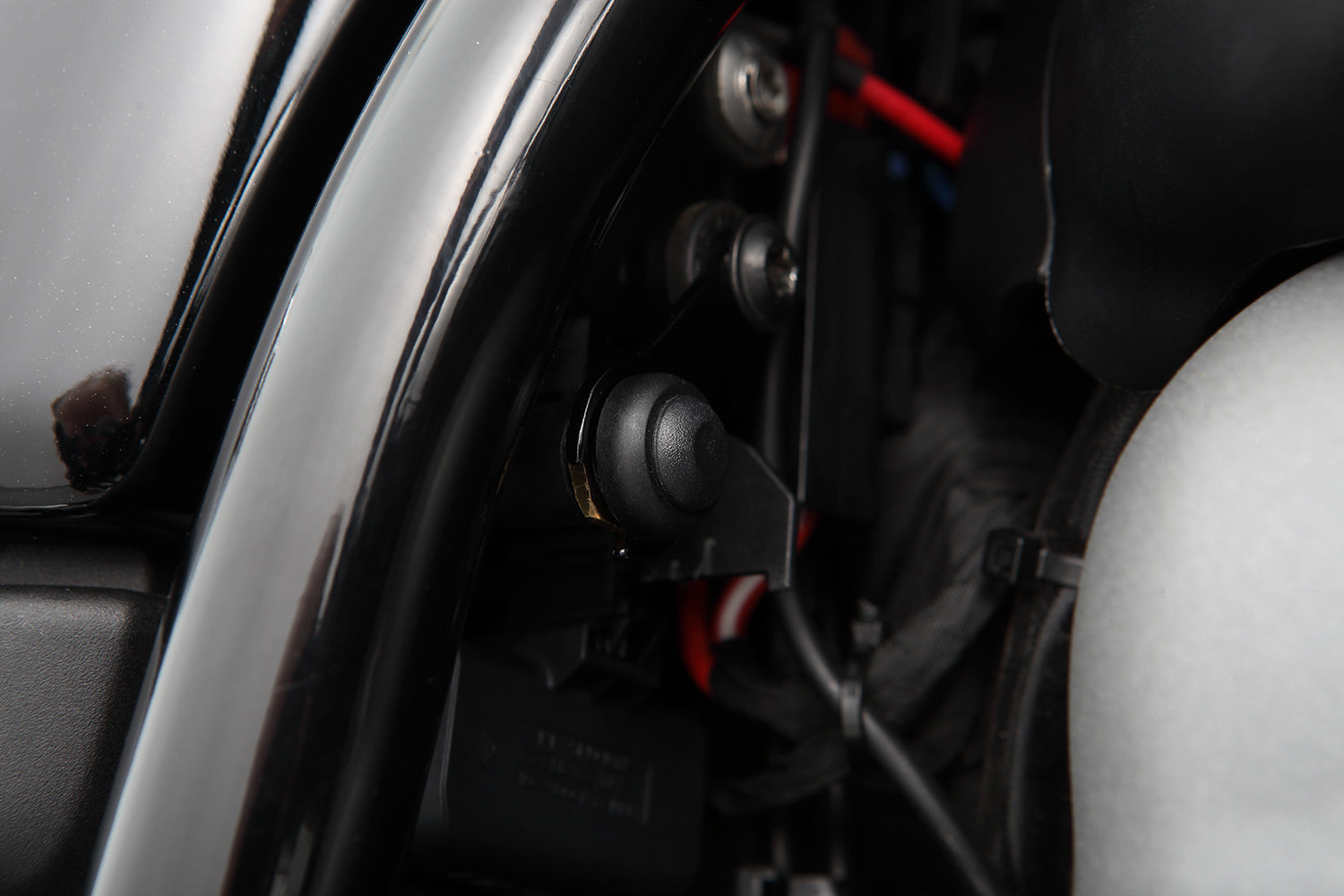 The button integrated in the cable set is mounted discreetly hidden in front of the right-hand side cover by means of a vehicle-specific holder. This makes it conveniently accessible for the rider. The lighting itself is mounted inconspicuously above the cardan.