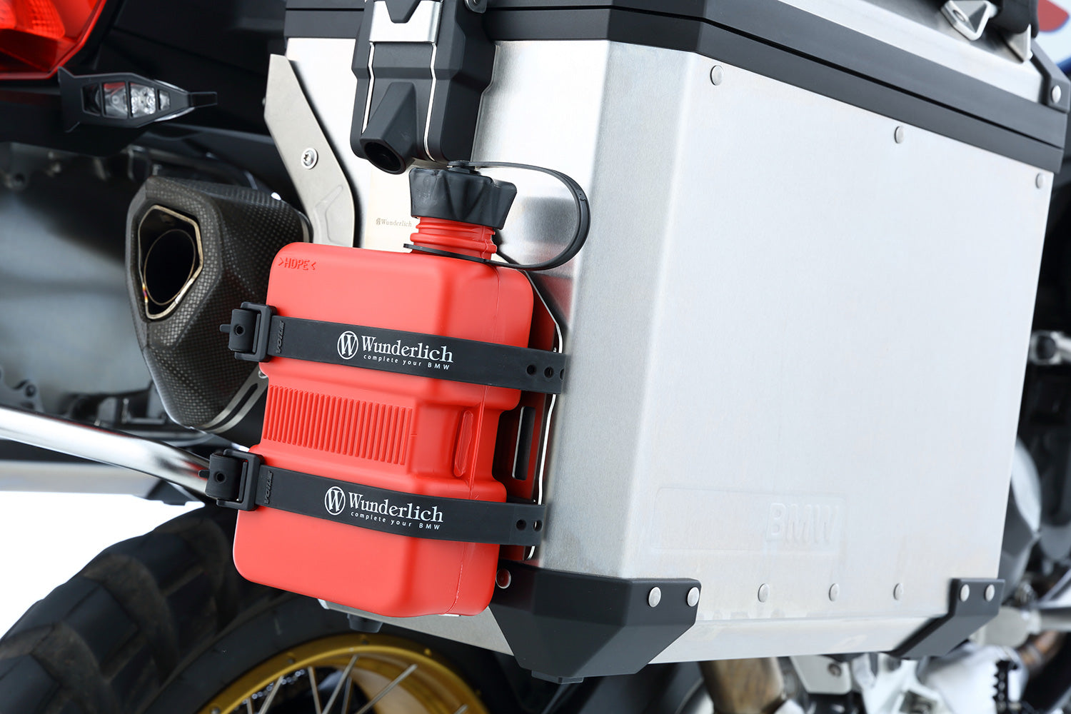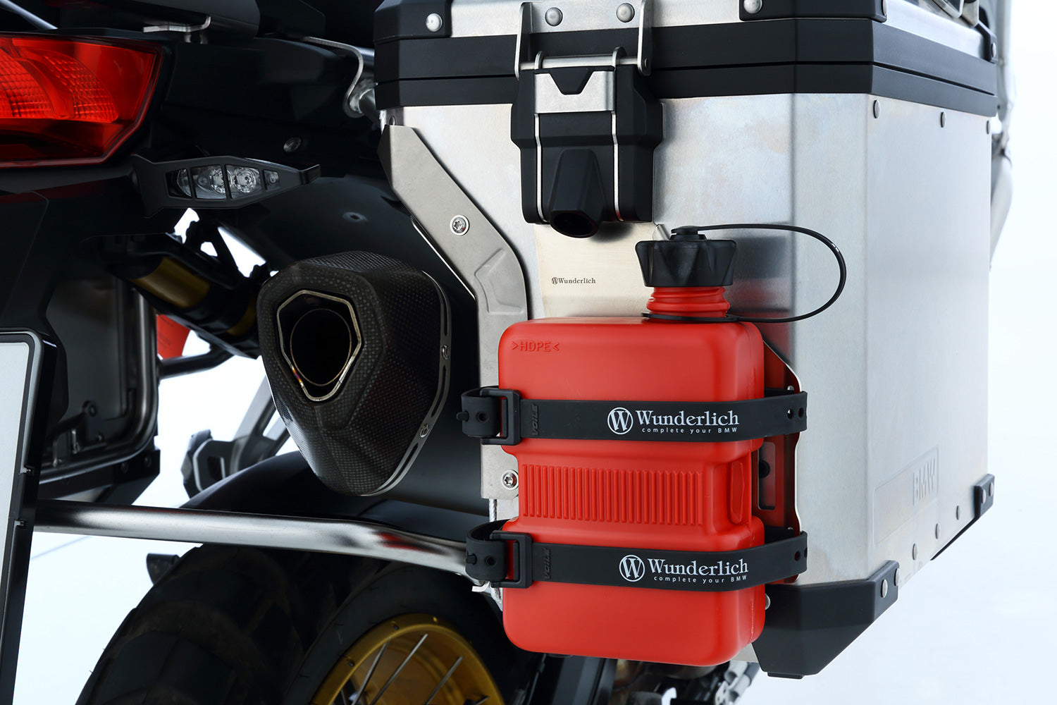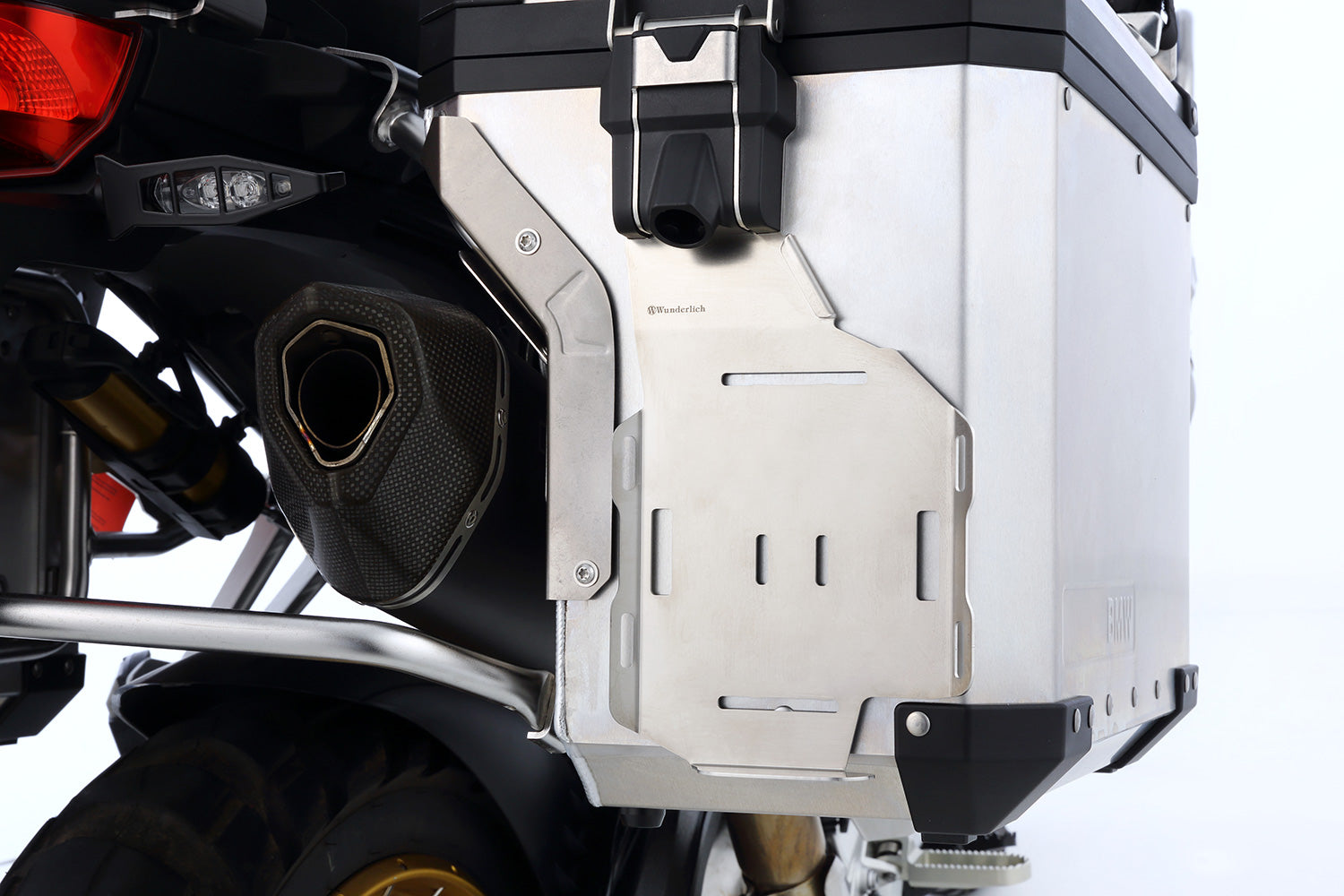 The rack fits our EXTREME cases (not the slimline variant) and the original BMW aluminium cases. It can be mounted on the right and/or left case. The secure attachment is very simple: The rack is attached permanently and theft-protected to existing points at the top of the respective case lock. At the bottom, the rack is securely fixed to the case with Velcro. It also serves as a cushion. It is therefore not necessary to drill holes in the case, which could lead to leaks.
