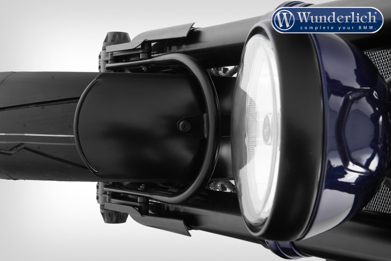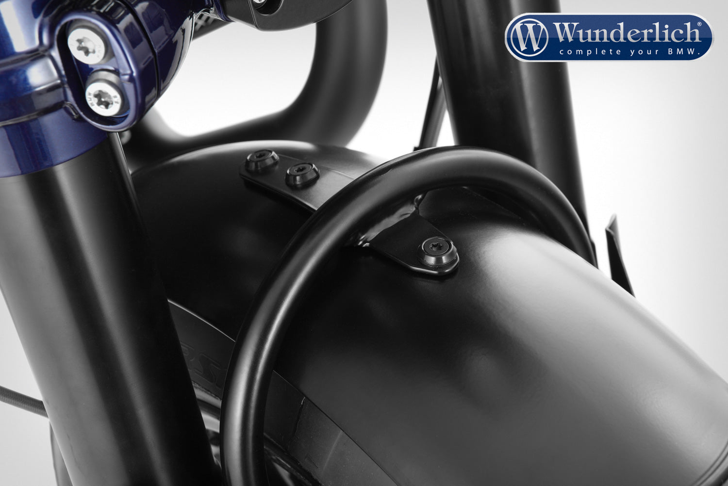 This short, attractive mudguard for the front wheel made of black powder-coated aluminium is a real eye-catcher: It gives the R nineT a new, striking and highly individual front-end look. In the high version, the quality protective guard is attached to the lamp holder with two black anodized retaining plates. The low version is attached to the original mounts with a black powder-coated round tube mounting bracket. Light, but highly stable.