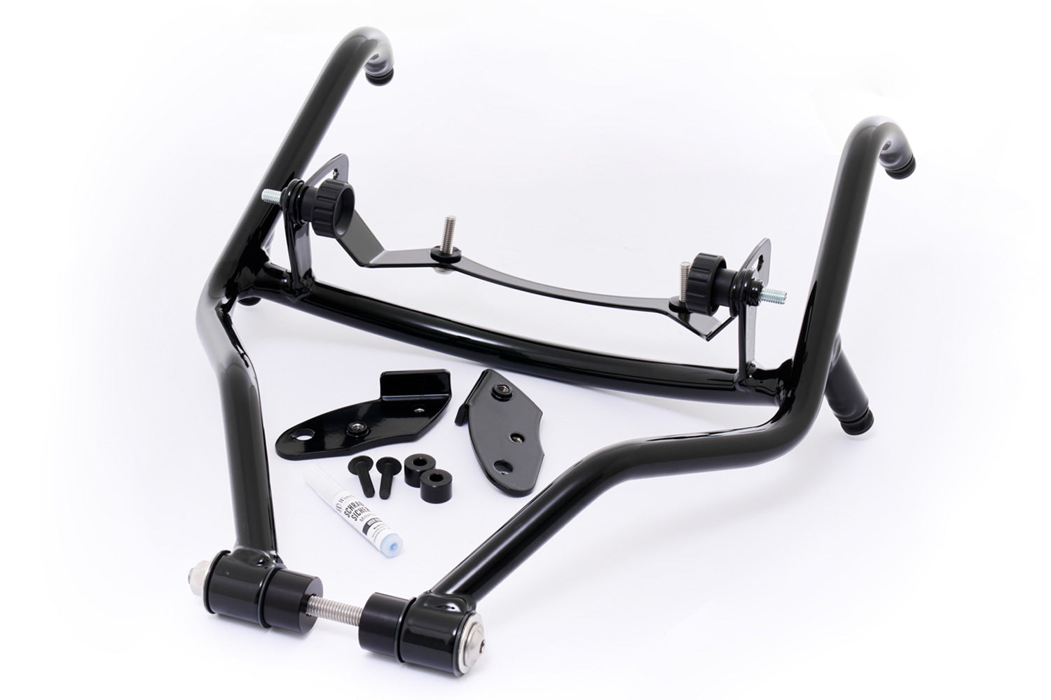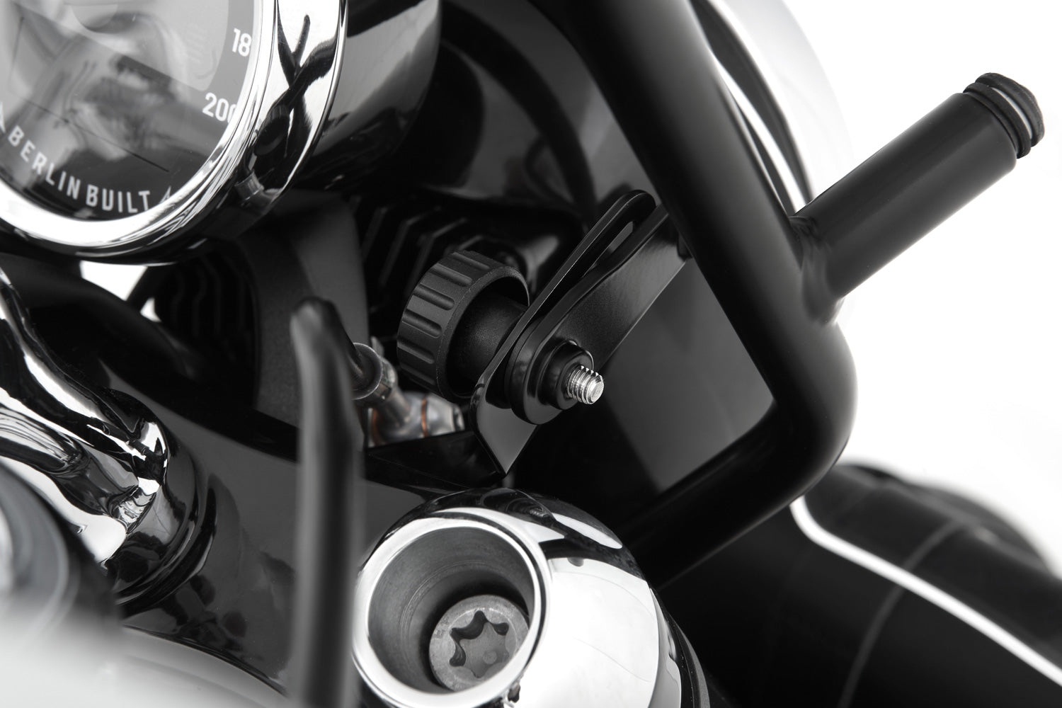 We manufacture the stylish construction of the windshield holder using solid 16 mm steel tube pipe. This is securely attached to the holders for the windshield as well as the instrument cluster. The angle of the windshield can be individually adjusted with ease thanks to the sliders attached to both sides. This locks securely using the handy knurled screws, which are easily accessible even with gloves. The adjustment area achieved on the top edge of the windshield is a generous 60 mm.