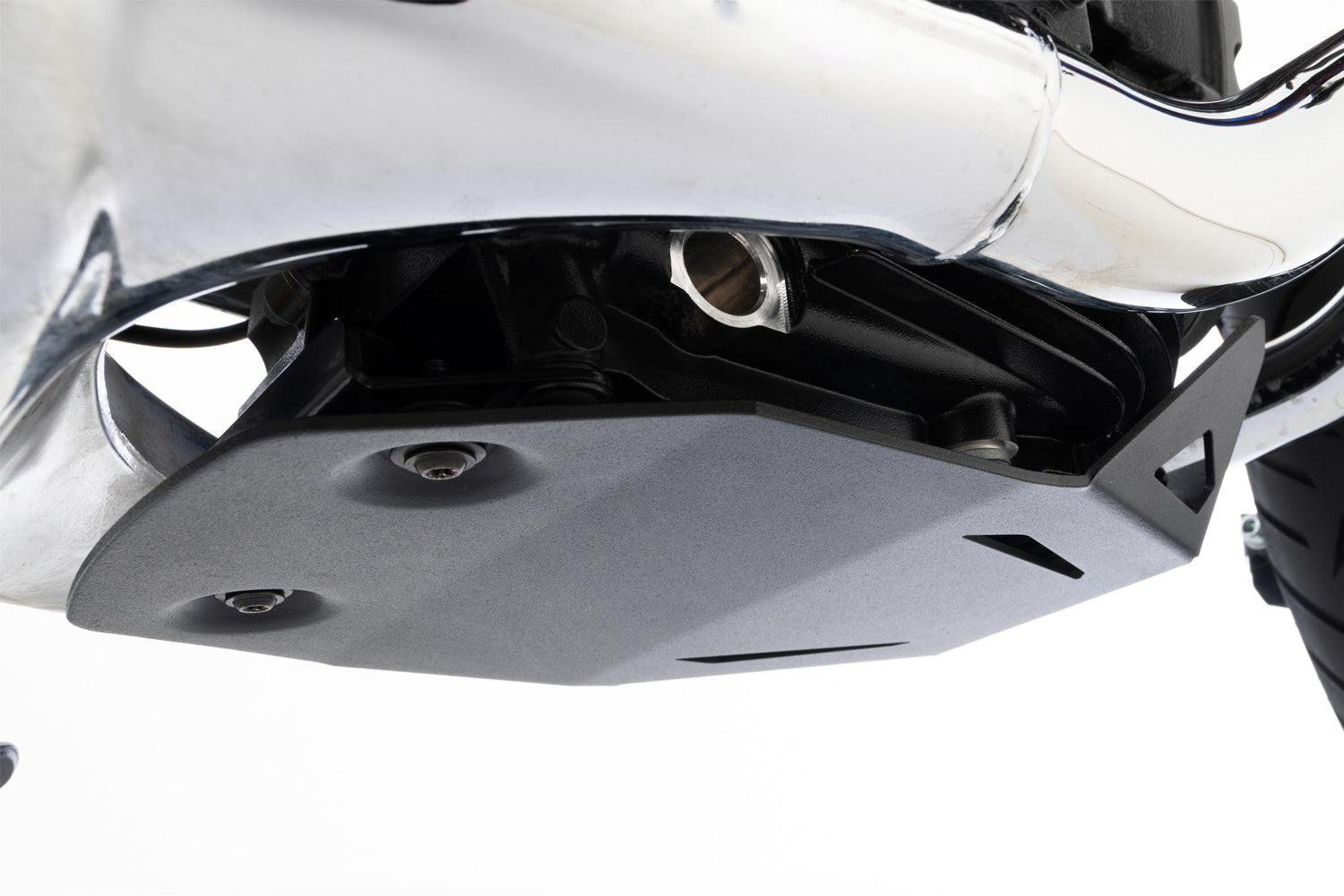 The functional Edge-Design and structural integration of our aluminium, one-piece engine guard PURE offers comprehensive protection for the engine casing and oil pan. The frontally and laterally integrated ventilation openings assist in cooling the engine, especially when covering long distances on the motorway. Angled deflector plates deflect stone chips or foreign objects thrown up by the front wheel, significantly reducing the risk of engine damage. Another advantage of this engine guard is that it diverts splashing water, for example when crossing ruts, downwards and thus significantly reduces thermal stress on the engine casing and seals, particularly when the engine is hot.