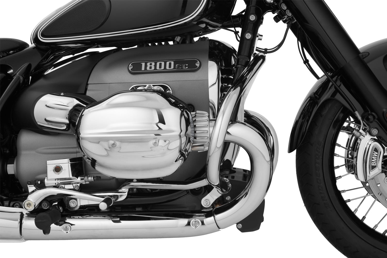 The first protection bar made of 32 mm pipe! We chose this dimension of pipe for two reasons: for strength purposes, to protect the R 18 in the best way possible and for aesthetic reasons. This is because only the 32 mm pipe looks balanced and aesthetically pleasing on the R 18 - and around the bulky manifold pipes. Additionally, we consciously chose a closed, single-piece form for the protection bar that, alongside the dimensions, contributes to the structural solidity. The high-quality chrome-plated protection bar thus integrates discreetly into the overall style of the R 18 while adding its own, coordinated accent. The spade-shaped form calls to mind the protection bar on the classical air-cooled BMW Boxer.
