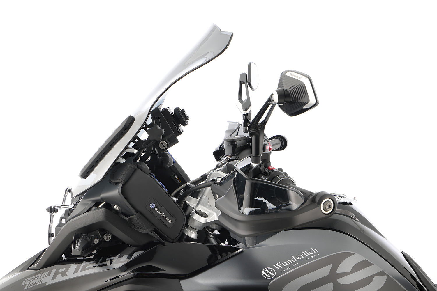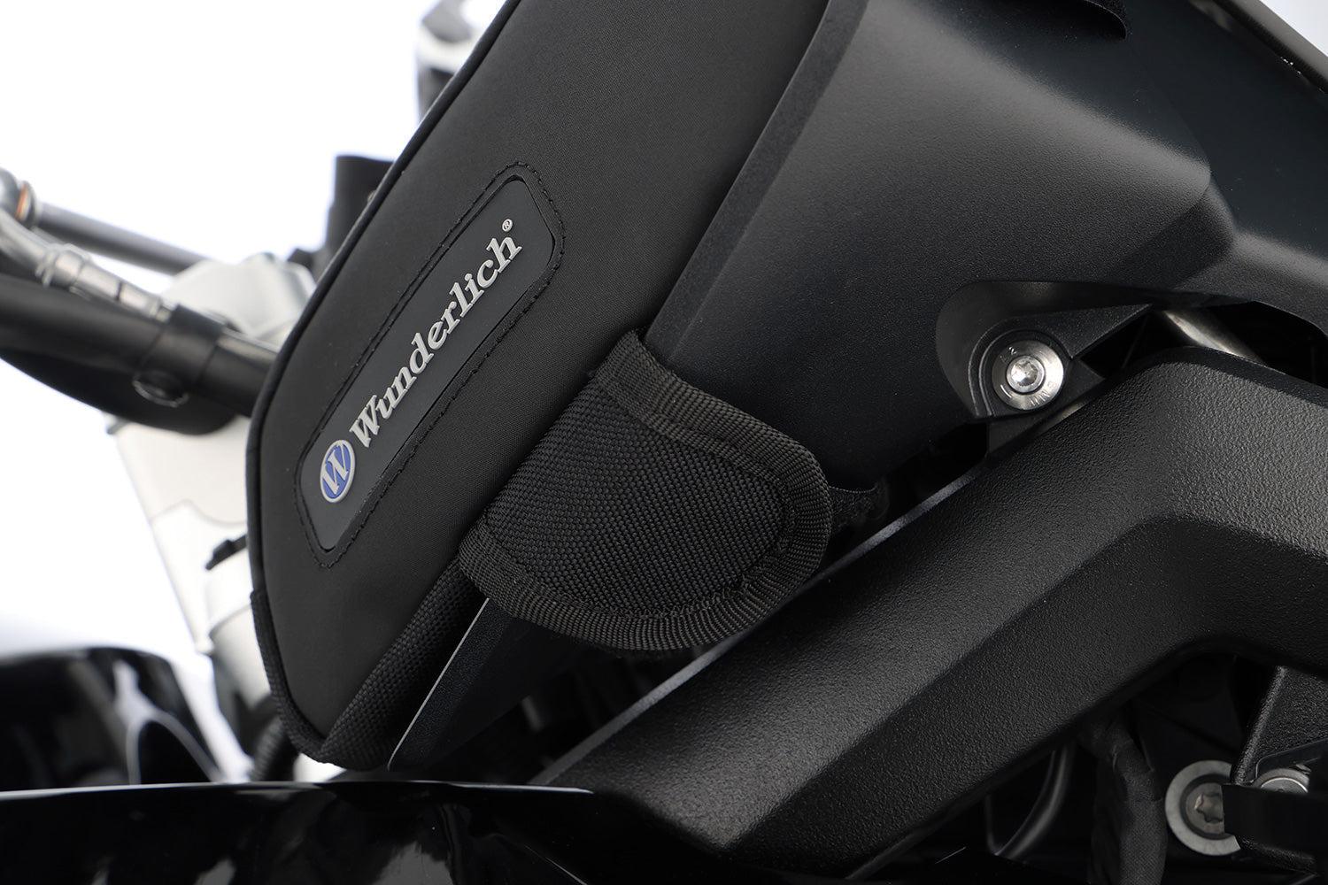 We have designed the functional bags in this set specifically to make intelligent use of the space created when using the optional wind deflectors. With these bags, we also placed great emphasis on securing good accessibility while on the road, helping you find your well-protected items quickly and easy. You then have a dedicated place for your vehicle documents and wallet. We have also optimised the clear design for large smartphones, such as the iPhone 14 Pro Max. The left-hand bag comes with a waterproof E-Connect cable input, so that smartphones and other devices can be charged while on the go. The bags are quick and easy to attach and remove using two strong Velcro strips. These also ensure that the bags don't flap about while you're riding. Thanks to their multi-layer design, the bags retain their shape even when empty. This also protects the contents from vibrations. The zips come with easy-to-grab clasps. They are water-repellent, dust-tight and also covered when closed. The fluorocarbon-impregnated CORDURA fabric used is extremely abrasion-resistant, UV-stable, water-repellent and also coated on the inside. The same applies to the blue inner lining, which provides the necessary contrast for finding small items quickly and easily. With Wunderlich brand logo.