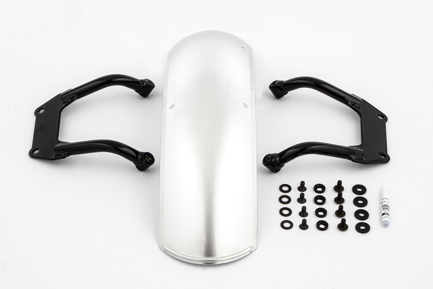 The characteristic holder for the front mudguard is constructed of sturdy, high-quality, powder-coated in three layers black-glossy tubular steel with a diameter of 16 mm. It is securely bolted together with the fender to the four standard attachment points.