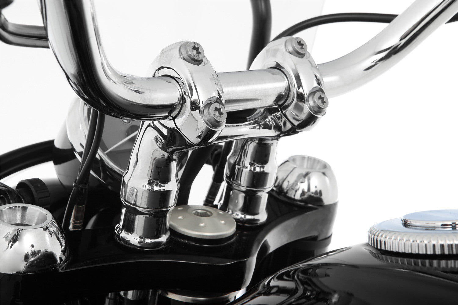 The design of our handlebar riser, which we manufacture from solid aluminum, elegantly blends into the area of the upper yoke. This allows the product to become a true attention grabber thanks to the premium finish of the high-quality chrome plating.