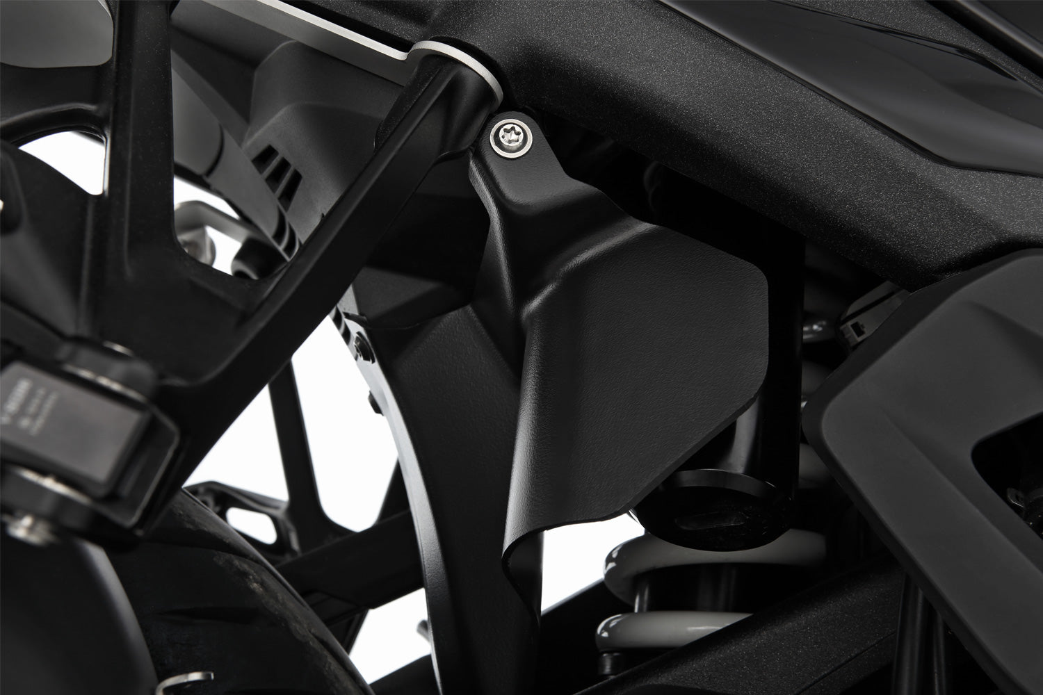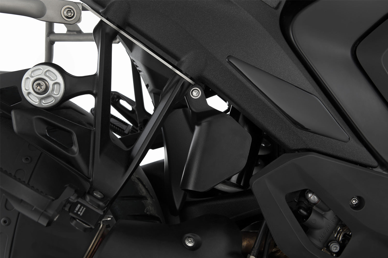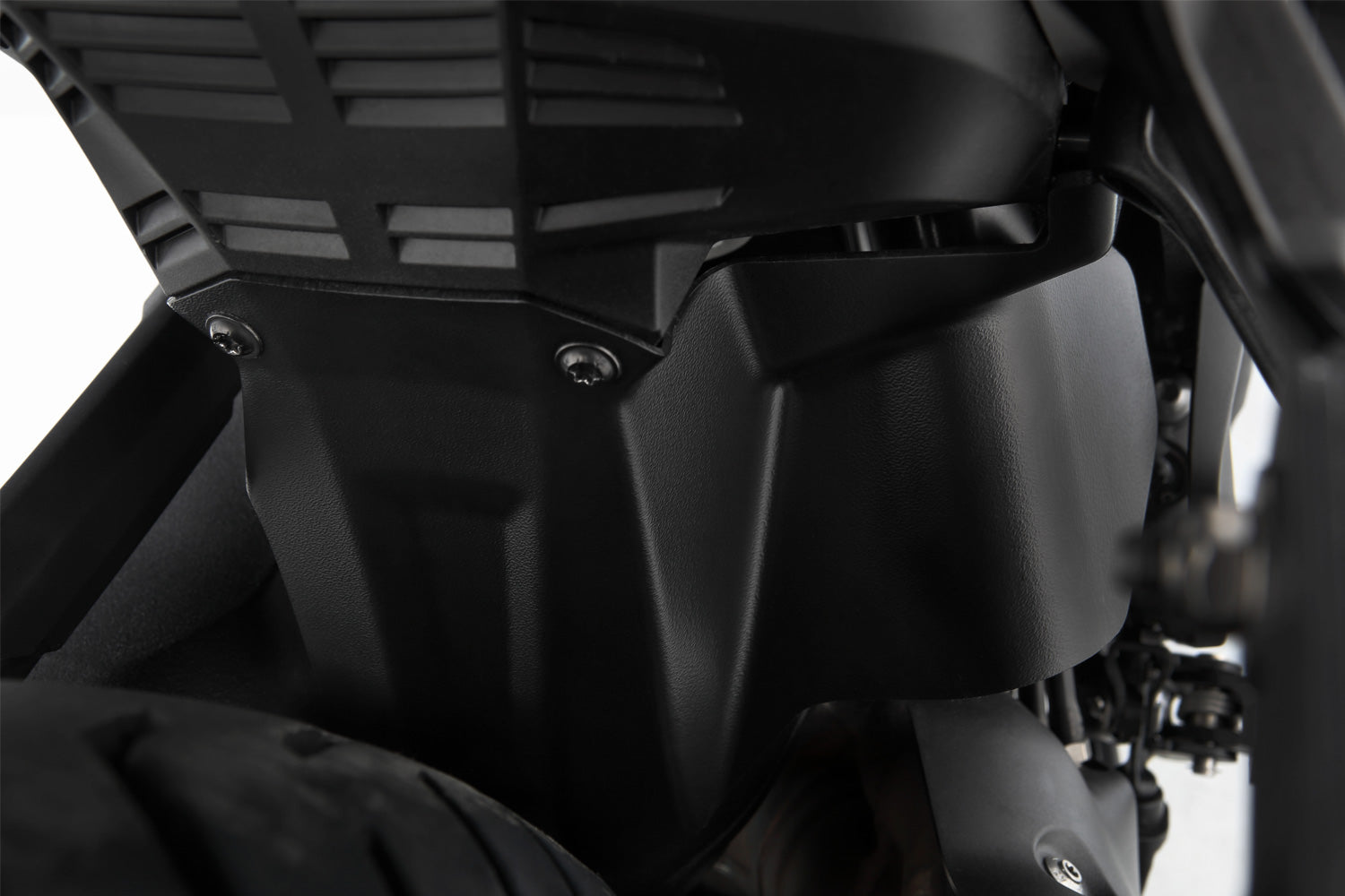 This inner mudguard protects the shock absorber, shock absorber mount, swingarm, and collector. It captures and reliably redirects splashed water. This useful component reduces and protects riders and passengers from spray and road dirt in the foot and shin area.