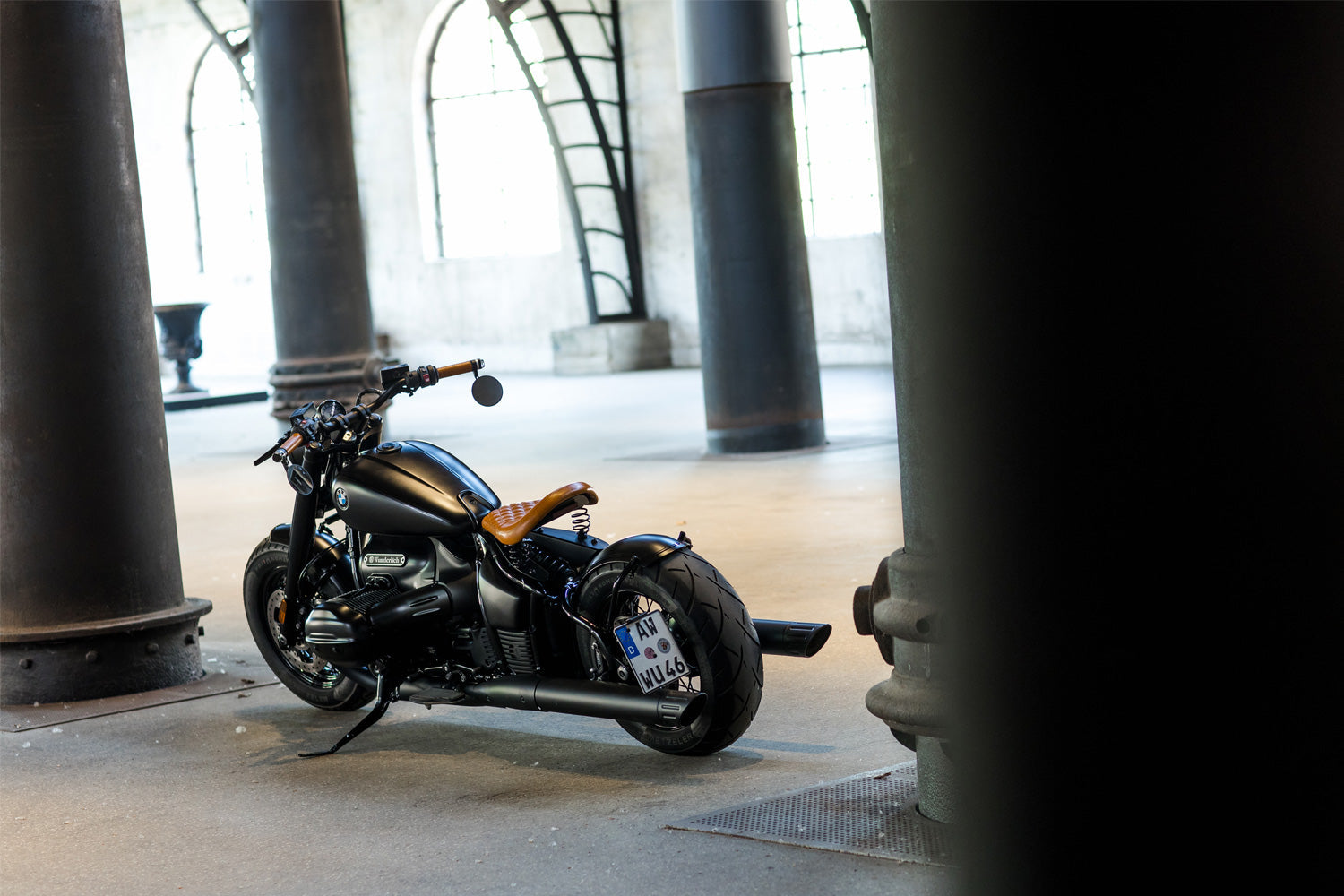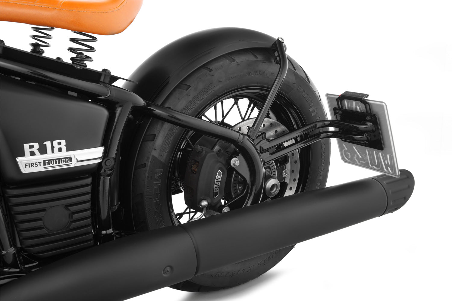 The elegant Wunderlich licence plate holder gives you a clear view of the superb back wheel of the BMW R 18. The skilfully designed construction also integrates brilliantly into the contours of the cruiser. In keeping with the refined frame of the R 18, we’ve powder-coated the licence plate holder in in three layers black-glossy and given it a clear lacquer finish. It mounts easily vibration damped on the existing attachment points on the swing arm. The cable guidance for the licence plate lighting is refined and leads invisibly through the pipes of the licence plate holder, while the LED licence plate lighting in the milled housing can be mounted either above or to the side.