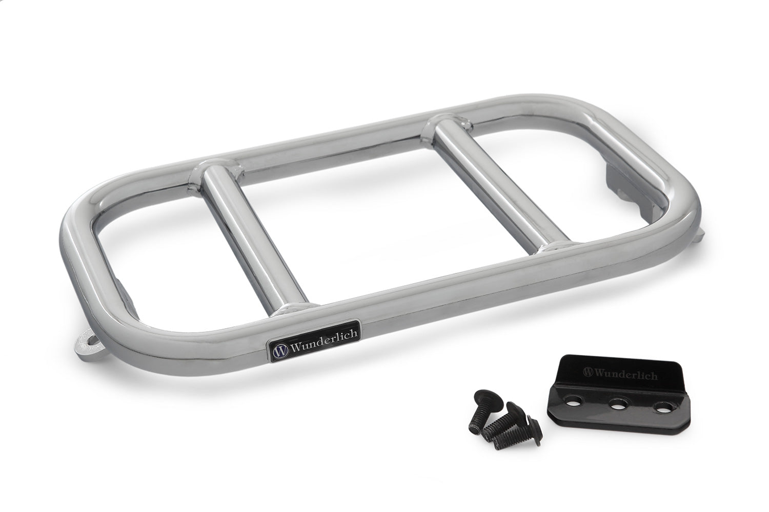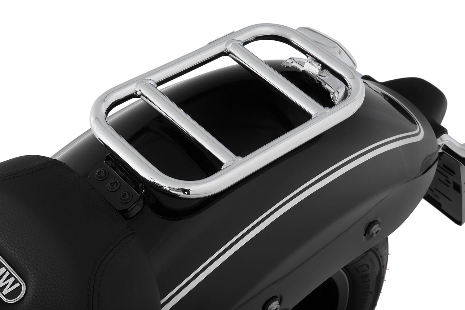 We manufacture the luggage carrier using 18 mm thick, chrome-plated precision steel piping. The same mounting points used to affix the passenger seat form a solid base for attachment. Naturally, the semi-circular, rear chrome trim is retained. The uncomplicated, sophisticated assembly means that the luggage carrier and passenger seat can simply be switched as required with little effort.