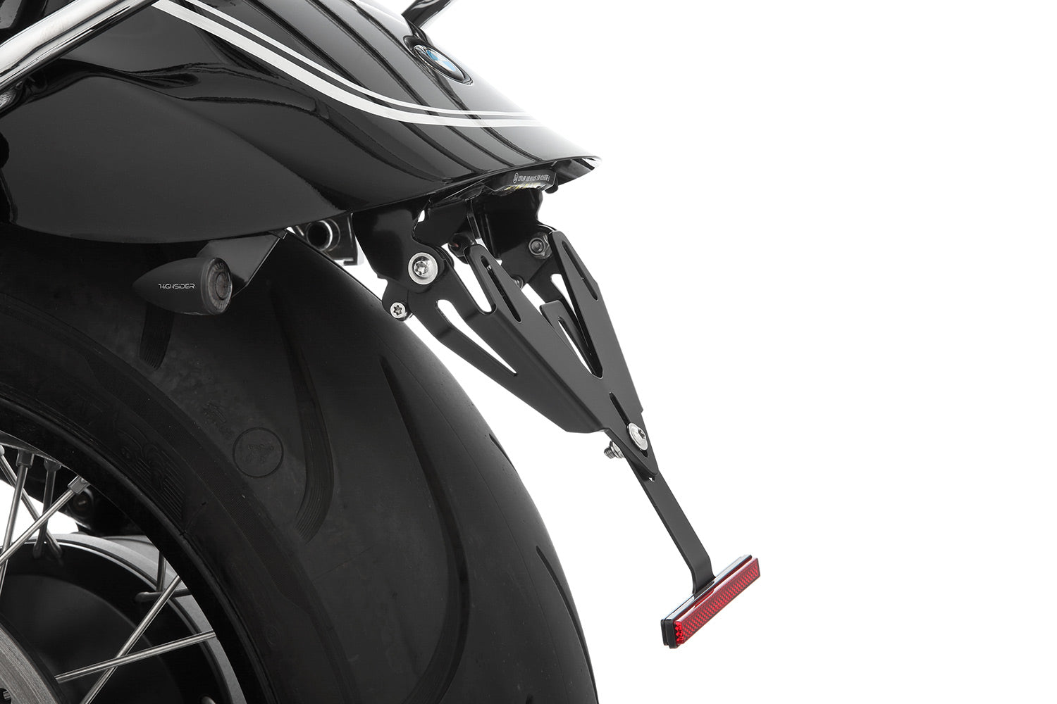 The conversion kit contains the brackets for the accessory indicators as well as the tiltable, puristically designed licence plate holder, which is actually far too attractive to disappear behind the licence plate. Both consist of high-quality, resilient stainless steel, which is black powder-coated. The (removable) rear reflector creates a delicate accent at the base of the licence plate. Includes LED licence plate illumination with E approval.