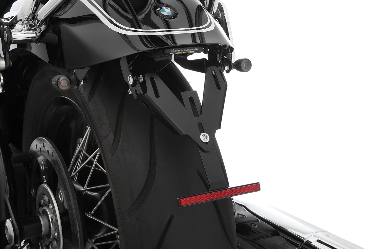 The conversion kit contains the brackets for the accessory indicators as well as the tiltable, puristically designed licence plate holder, which is actually far too attractive to disappear behind the licence plate. Both consist of high-quality, resilient stainless steel, which is black powder-coated. The (removable) rear reflector creates a delicate accent at the base of the licence plate.