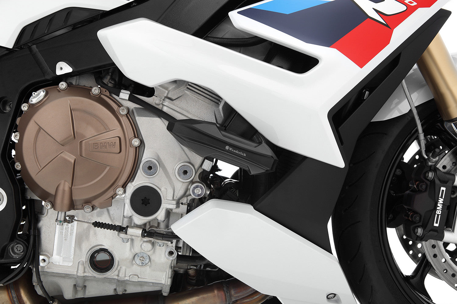 We originally developed our RACING protection pads for use in racing and with Wunderlich MOTORSPORT. This is why the pads are mounted on the right and left of the frame using solid attachments. On the left we also use a rotation-proof 2-point holder. For the right, we've constructed an elaborate adapter – milled to perfectly match the contour – that is used to mount the protection pad in a form-fitted manner.