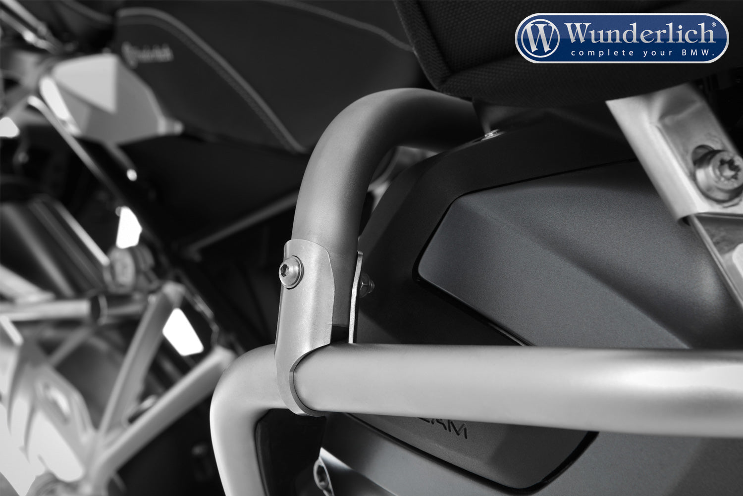 The rear, free end of the original engine protection bar for the Adventure has no additional support against the frame. It thus represents the Achilles heel of the engine protection bar. In the event of a crash or a fall it tends to give way because the forces are not immediately transferred to the frame. This brings the threat of damage to the valve cover.