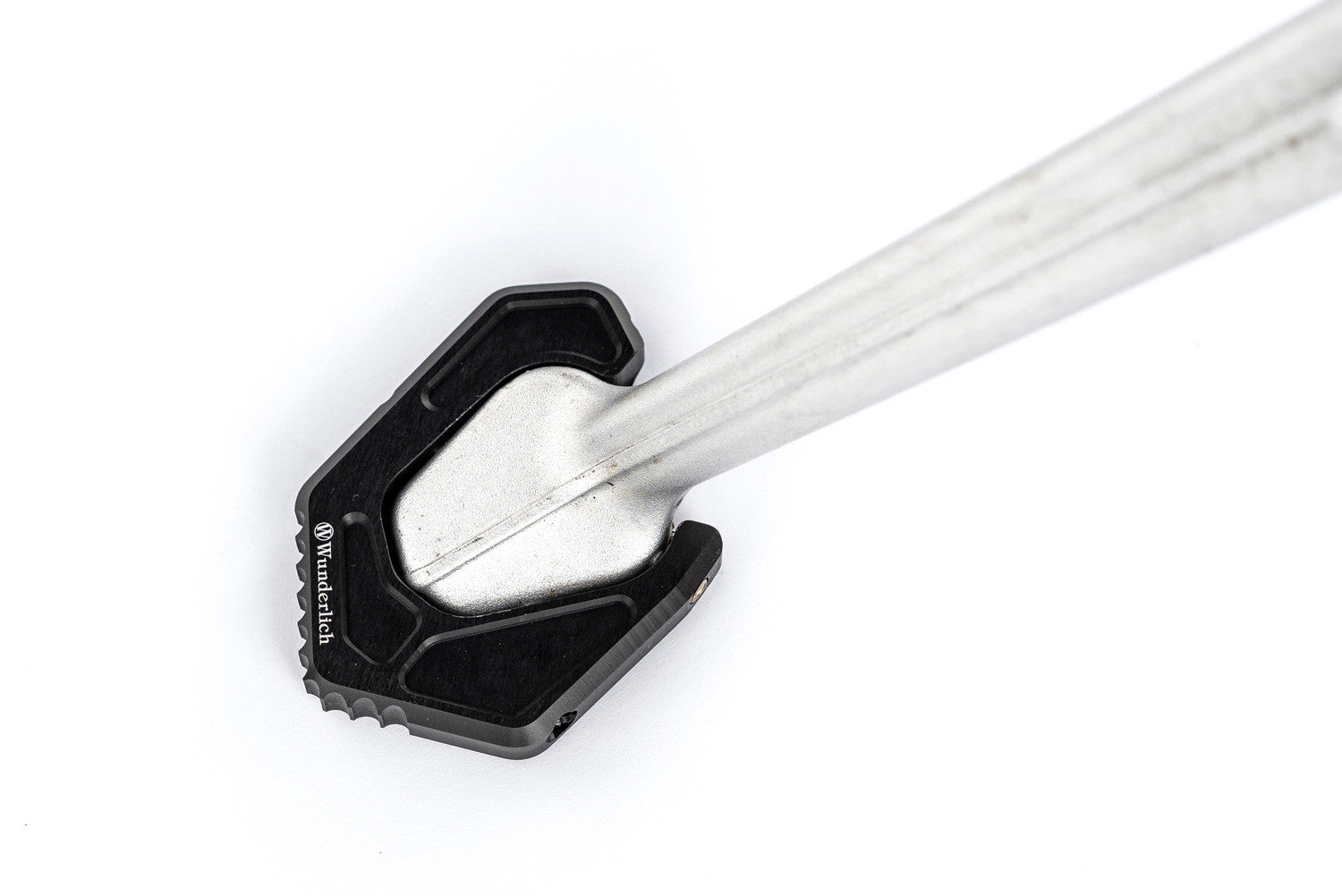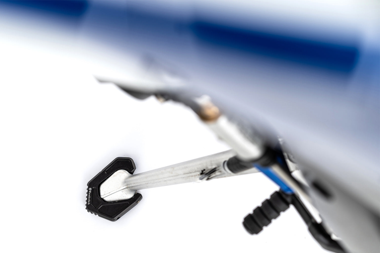 The life insurance for your BMW: The contact area of the original side stand is too small, meaning there is a risk of your BMW slowly sinking, often unnoticed, on both hot tar surfaces as well as on lightly chewed up ground. In the worst case, the bike falls over. This often results in annoying damage. Our precisely milled enlarger that can be quickly screwed onto the side stand provides help here and effectively eliminates this design flaw. And to ensure that the side stand can be securely folded out with the heel of your boot, we've also incorporated high-grip external teeth.