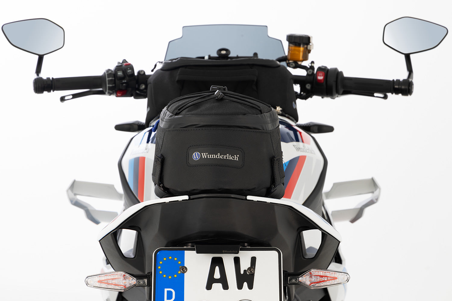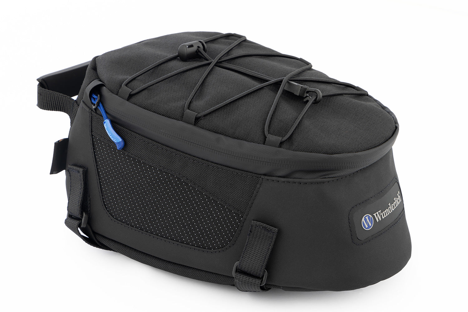 The bag has a volume of six liters. It is rigidly designed and closes with a water-resistant, dustproof zipper. This provides secure support and protection for luggage, and it doesn't flutter at high speeds. The blue interior lining, typical of Wunderlich, provides a contrasting background against which even small travel items can be easily recognized. The lid has an adjustable net on the top, made of elastic zigzag-arranged rubber bands, for items like gloves, for example. For easy transport, we have provided an ergonomic handle.