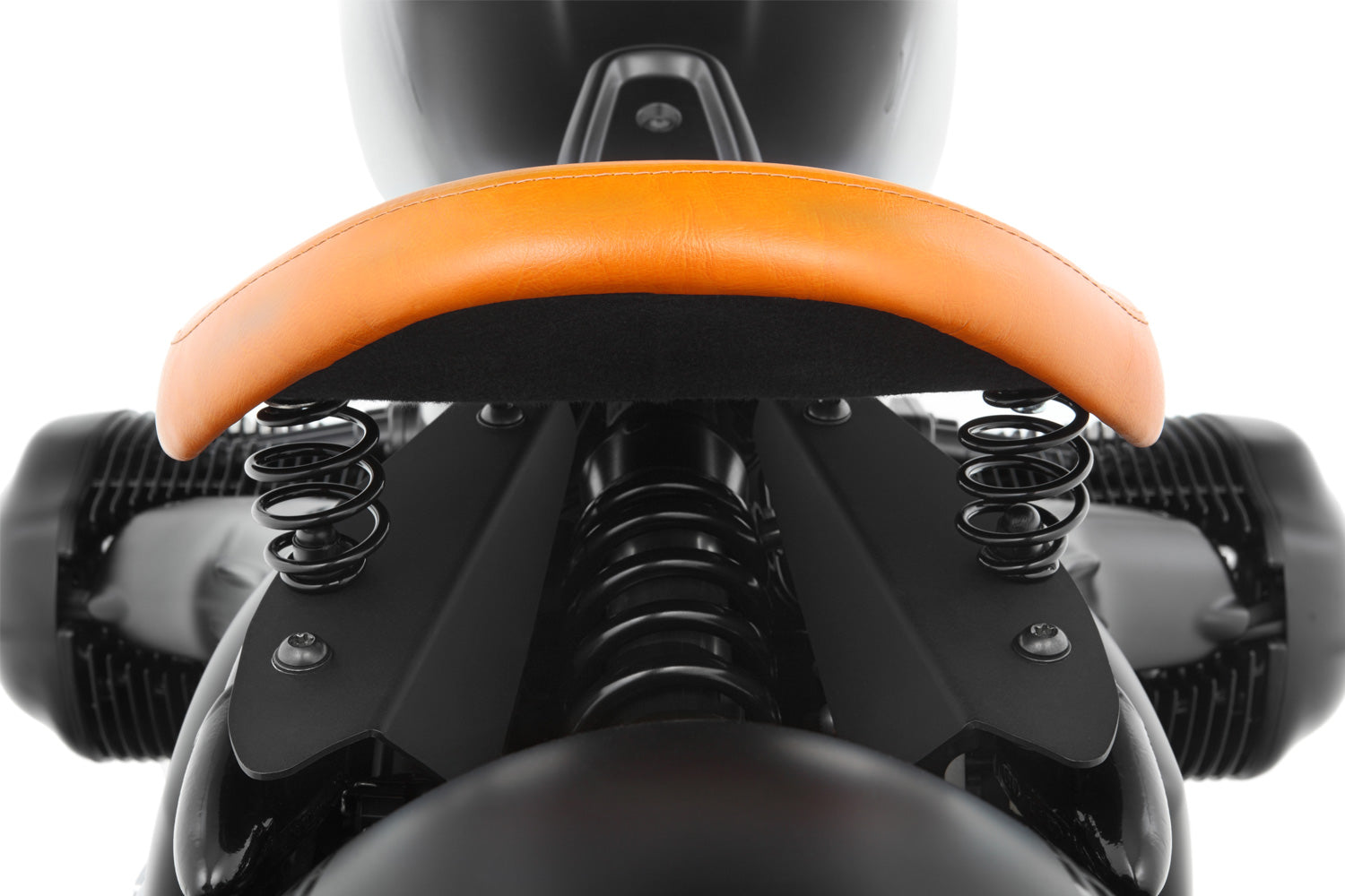 Exclusive and old school: Unique swing saddle covered with genuine leather in the "RockBob" style, matching the tail of the BMW R 18 series.