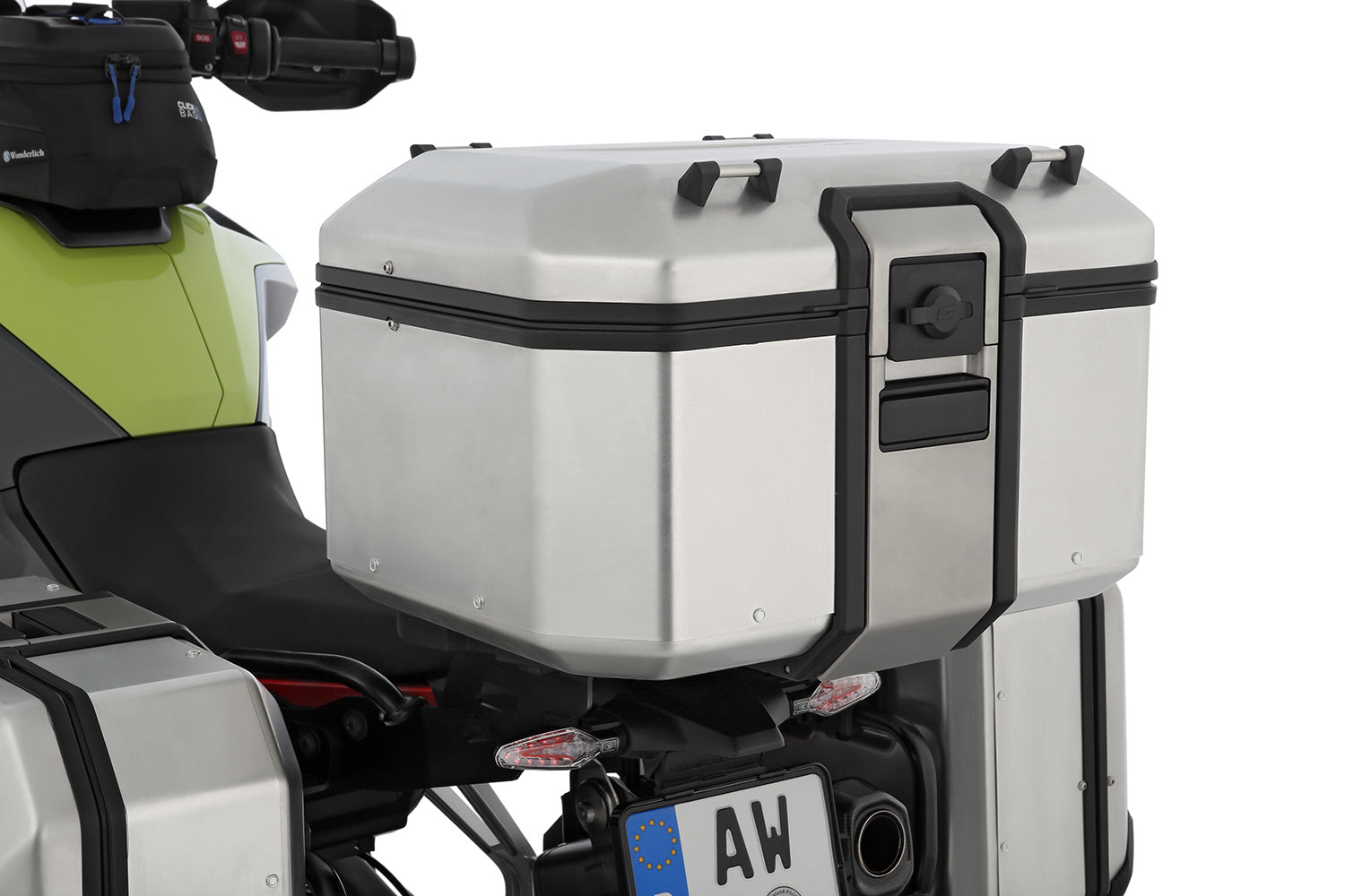 The aluminium of the X-CASE is hardened. This meets the requirements for robustness and light weight. This makes them ideal for adventure touring – they also meet the requirements of classic touring. The lightweight X-CASE topcases will stand by you on every terrain! To ensure that no extra key is needed for the luggage system, the X-CASEs are supplied with lockable locks that can be coded to the vehicle key. A matching cap protects the lock from moisture and dirt.Attaching to the carrier is straightforward. The stainless steel locking mechanism has an integrated, foldable carrying handle that allows the topcase to be opened, closed, mounted or dismounted in seconds. The integral design is contemporary with a high recognition value.The consistent use of only high-quality materials ensures the sustainable durability of the X-CASE luggage system. The high-quality aluminium sheet and the octagonal shape designed with stability, weight optimisation and aerodynamics in mind contribute to this. The frame is equipped with a proven, absolutely dust and waterproof sealing system that reliably protects the contents.Thanks to the four lashing eyes on the lid, additional luggage can be securely fastened and lashed. The interior of the topcase is lined with high-quality, non-slip and damping foam, which helps protect the contents from vibrations and shocks.After opening the lock, the lid can be opened completely and the X-CASE topcase can be conveniently loaded from above.The lid is decorated with a high-quality embossed Wunderlich brand logo.