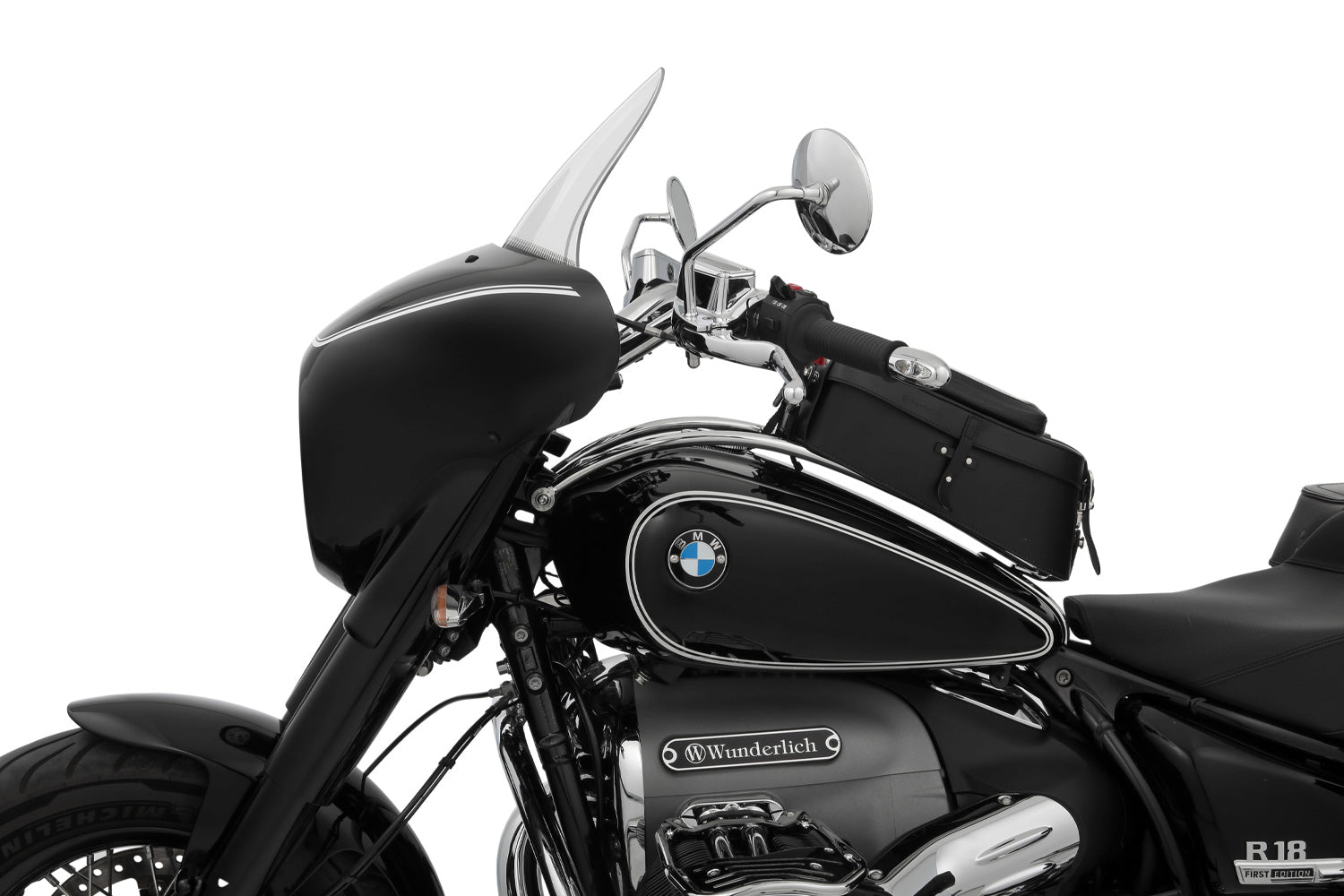 Combining our high-quality TOURING windshield with our HIGHWAY fairing noticeably improves the touring and long-distance suitability of the R 18, not only for Route 66. The aerodynamic shape of the windshield, which leans towards the rider and is specially adapted to the HIGHWAY fairing, provides effective relief from the wind and the best protection from the elements. This is especially true at medium speeds. Together with our Highway fairing, the integrated windshield ensures an overall optimised laminar airflow around the R 18.