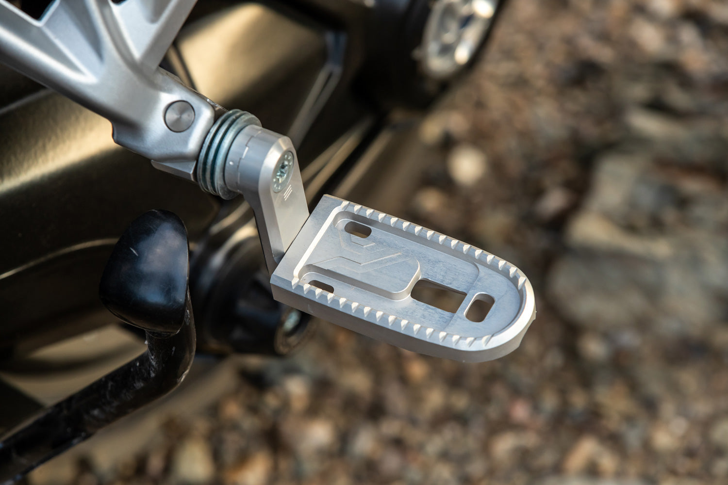 Our Vario rest system is the ultimate solution when it comes to adjustable footrests. With an adjustment range of 100 mm diameter, it leaves nothing to be desired. No matter whether you've got big feet or small ones, whether you want to increase the lean angle freedom or just comfortably relieve the knee angle. The eightfold adjustment option of a full 360° ensures enormous flexibility. This win for comfort is available for rider and passenger. For sporty riders, we also offer the rests in a bevelled design. The delivery always comes with German Type approval. All parts are made from high-solidity aluminium and anodises in silver or black.