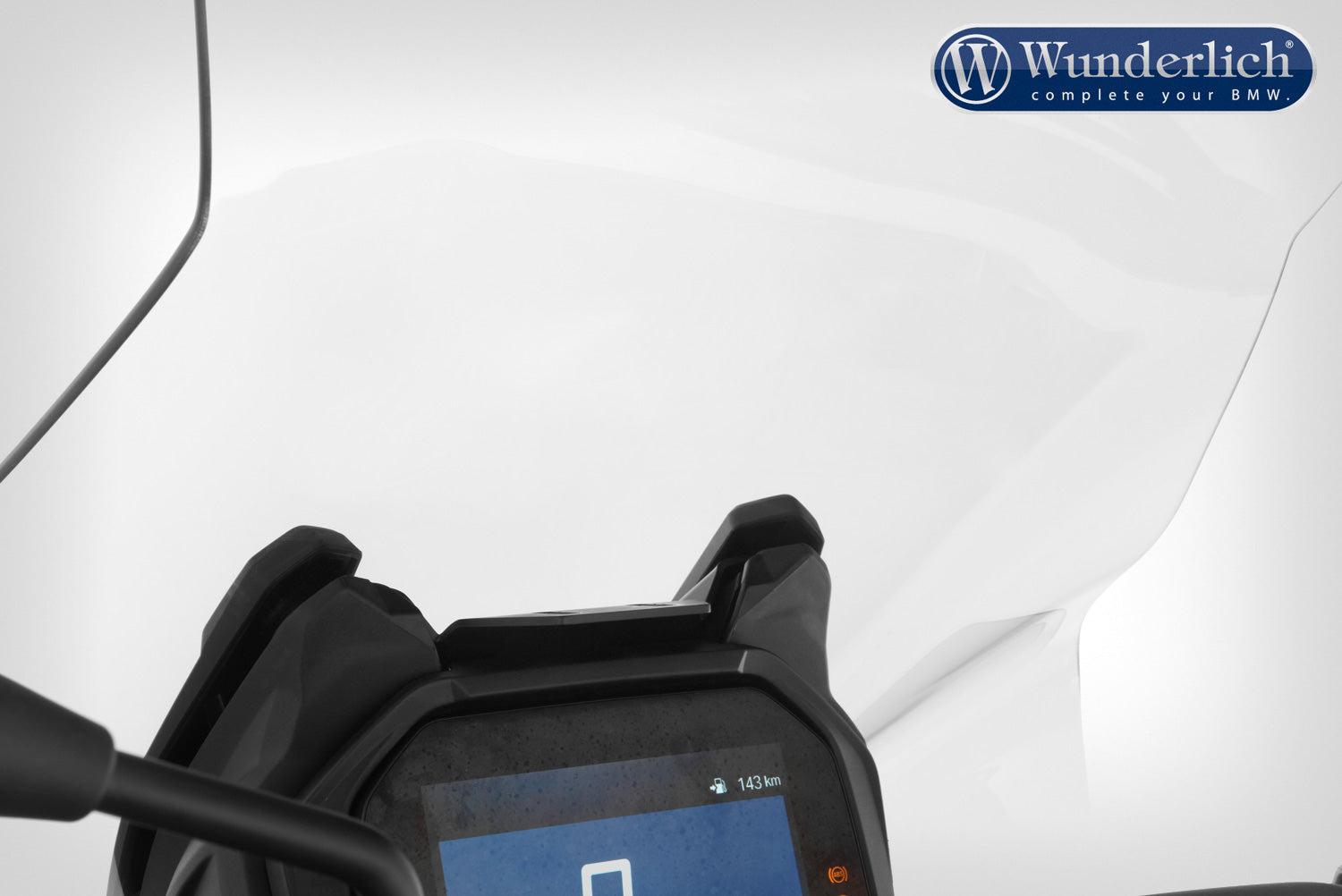 Our elegant, transparent "MARATHON" windshield provides optimum comfort and protection in the urban environment, on long tours and at high speeds. The windshield is angled towards the rider and aerodynamically formed so that it dampens turbulence effectively, softening it and reducing it to a minimum. This is helped by the fact that Wunderlich windshields come with a hand-polished rounded rim so that they fundamentally don't require any edge protection, which can cause additional vibrations, noises or turbulence. It is wider at the bottom than the original windshield and ensures perfect weather protection for all body sizes. It integrates perfectly into the overall layout of the Scooter. It provides relief from wind pressure for the upper body, arms and body, especially at high speeds.